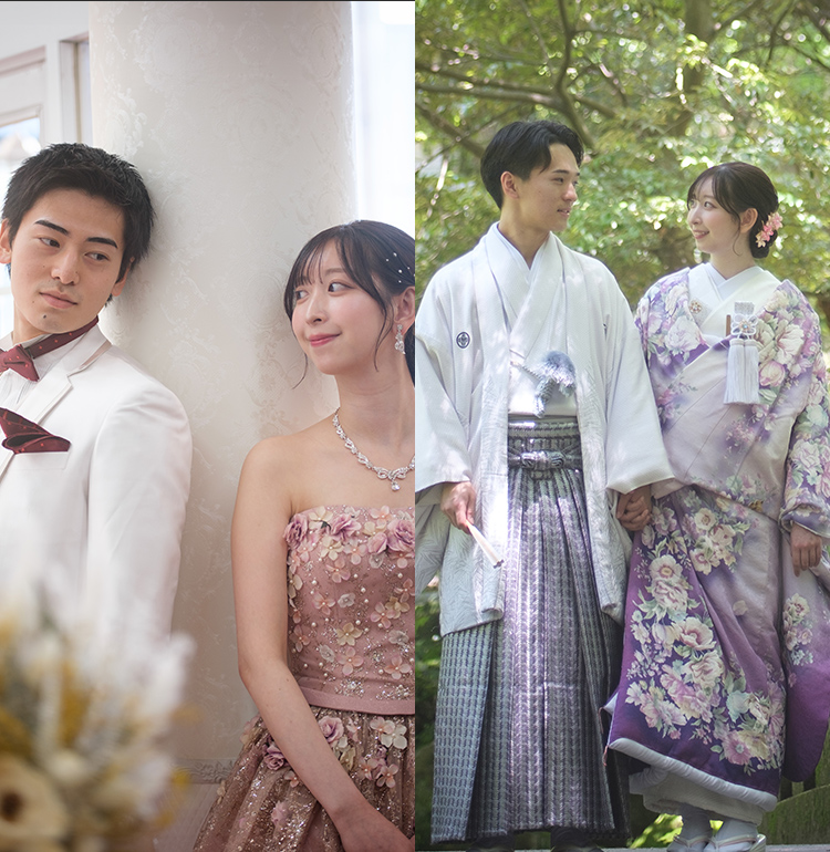 自由で手軽に撮影できる専用スタジオと、非日常の異国のような特別スタジオの2つの空間をご用意しております。豊富な衣装の中からお選びいただき、フリー撮影をいたします。せっかくの記念となる撮影ですので、撮りたいイメージやご要望について、ぜひご相談ください。